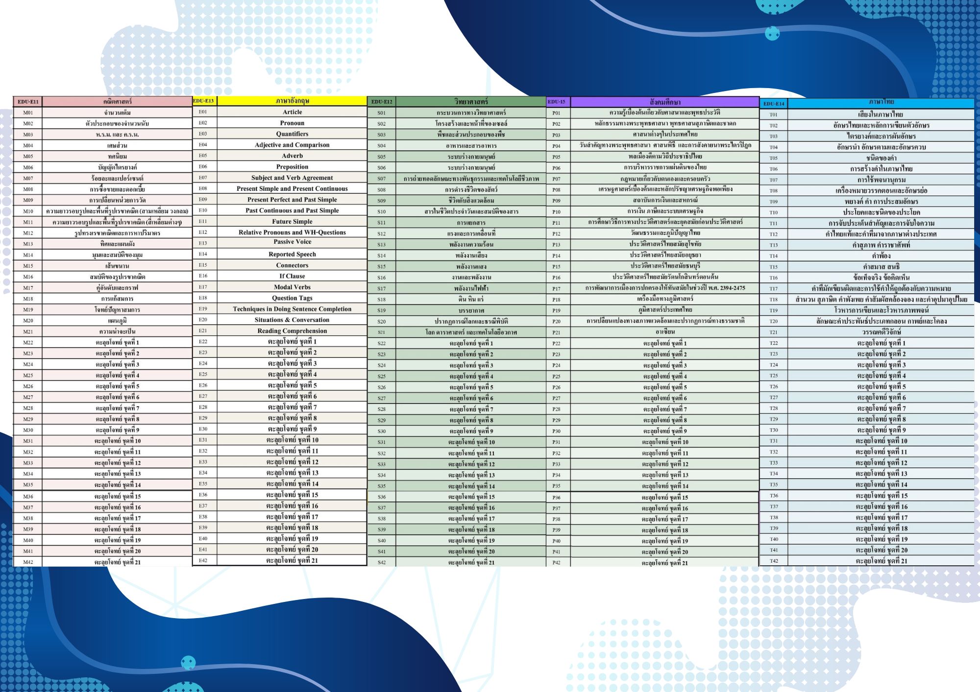 EDU สอนครบ 5 วิชา วิทย์ คณิต อังกฤษ ไทย และสังคม เพื่อพิชิตโรงเรียนในฝัน ด้วยสูตรลัดและเทคนิคที่ไม่เหมือนใคร เข้มข้นด้วยเนื้อหา และจัดเต็มทุกแนวข้อสอบ